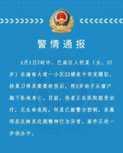 ·重慶一女子砍傷婆婆后將3歲幼子拋下樓致死,已被警方控制。鄰居稱女子高空拋子前多次高空拋物,知情人稱扔小孩母親避開了安全氣囊。