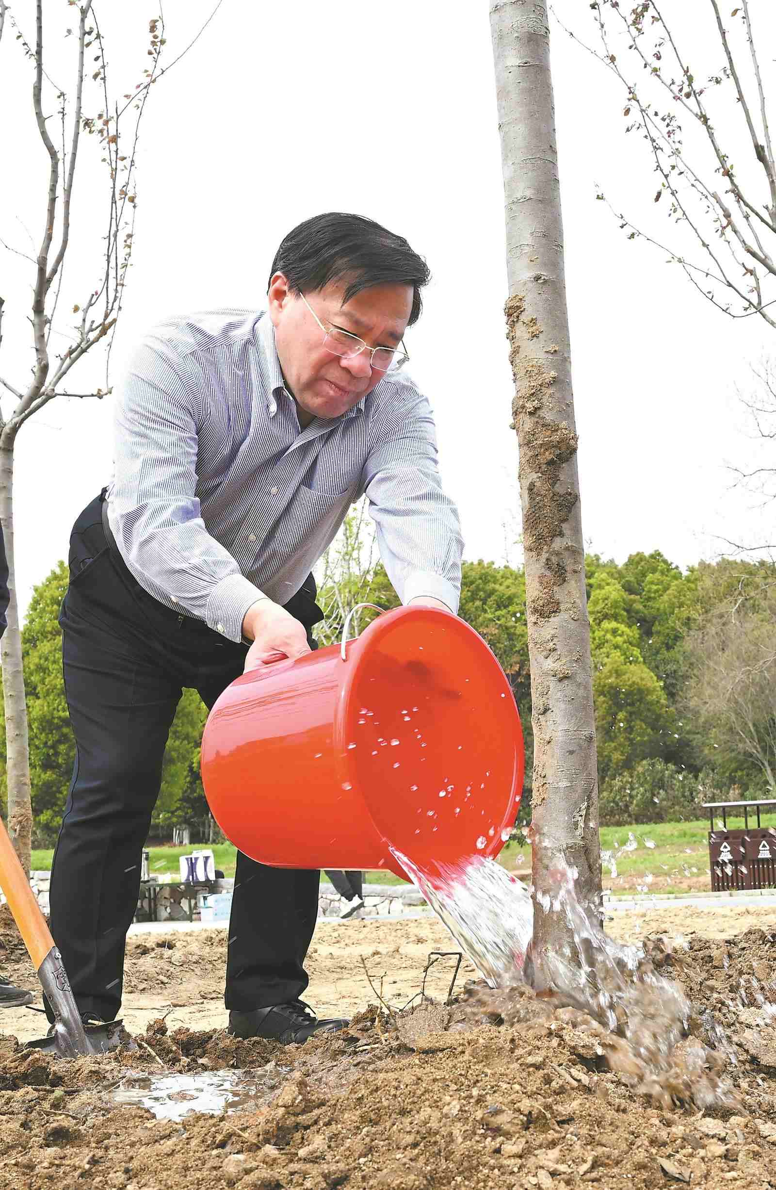 隨后,韓俊等安徽省領導拿起鐵鍬走向植樹地點,同現場的干部群眾一起,將一棵棵樹苗植入樹坑。大家揮鍬鏟土、培土圍堰、提水澆灌,經過一番忙碌,一排排新栽下的廣玉蘭、桂花、紫薇、海棠等樹種,在和煦的春風中昂然挺立,孕育著勃勃生機,煥發(fā)出綠色希望。植樹過程中,韓俊對植樹造林工作提出明確要求。他說,植樹造林功在當代、利在千秋。要扎實開展全民義務植樹,合理優(yōu)化國土綠化格局,持續(xù)提高造林綠化質量,鞏固和增強生態(tài)系統碳匯能力,不斷提升生態(tài)系統多樣性、穩(wěn)定性、持續(xù)性,切實把好山好水保護好。各級領導干部要帶頭抓好國土綠化和生態(tài)文明建設各項工作,大力營造愛綠、植綠、護綠的文明風尚,帶動更多干部群眾爭做生態(tài)文明建設的實踐者、推動者,共同種出屬于大家的綠水青山和金山銀山,繪出人與自然和諧共生的美麗安徽新畫卷。