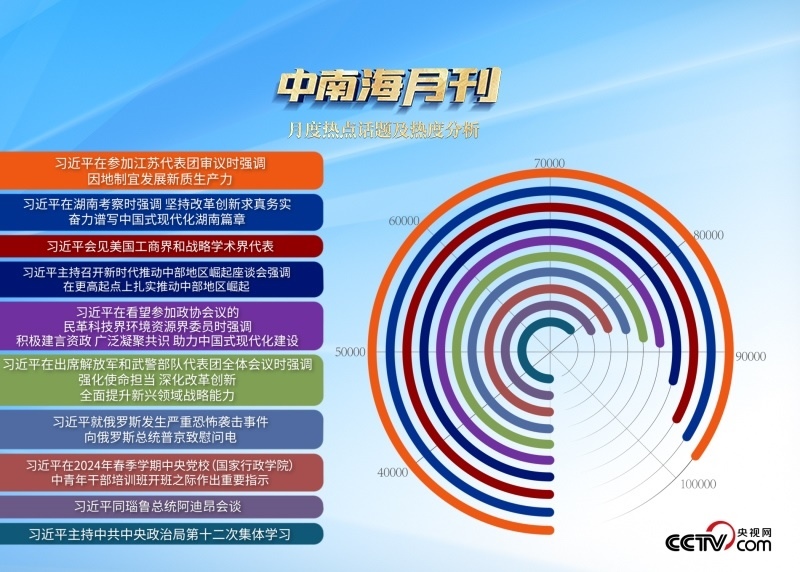 本月,習近平總書記深入湘江大地,到工廠、訪學校,走進田間地頭;歡迎遠道而來的新老朋友,談發(fā)展、謀合作。央視網(wǎng)《中南海月刊》運用智能大數(shù)據(jù),與您一起回顧總書記3月的內政外交。