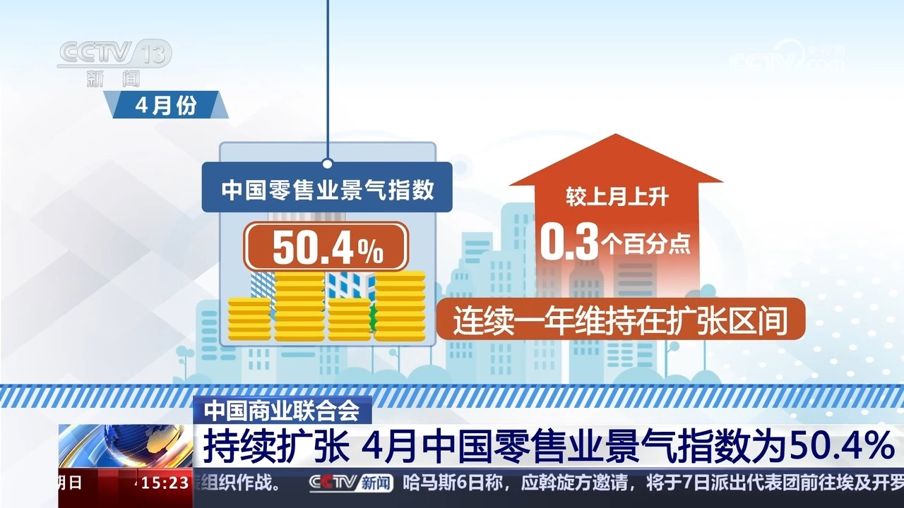 央視網(wǎng)消息:中國商業(yè)聯(lián)合會最新發(fā)布的中國零售業(yè)景氣指數(shù)顯示,4月份,中國零售業(yè)景氣指數(shù)為50.4%,連續(xù)一年維持在擴張區(qū)間。全國商品經(jīng)營類企業(yè)對4月份盈利增長恢復的預期開始好轉(zhuǎn)。