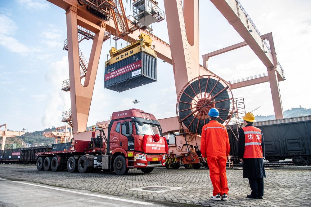 1月4日,在重慶萬州新田港站,工作人員進行集裝箱吊裝作業(yè),將專列貨物轉運至公路物流環(huán)節(jié)。新華社記者 唐奕 攝