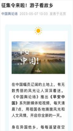 每天早7點,新媒體用戶一起床,打開《中國輿論場》,美妙的音樂喚醒耳朵,美麗的風景賞心悅目,再加上一句經(jīng)典典故,迎接美美的一天!