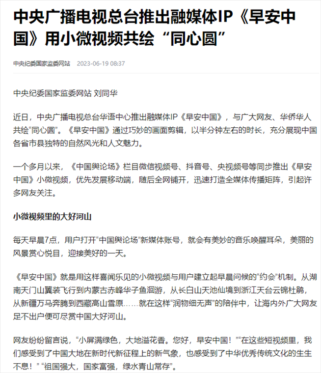 2023年4月26日,總臺華語中心融媒體IP《早安中國》帶著對祖國大好山河的精彩呈現(xiàn)、對中華文化的壯美豪情、對海外游子的深深眷戀、對家鄉(xiāng)發(fā)展的美好祝福,開始在中央廣播電視總臺大小屏上線亮相。