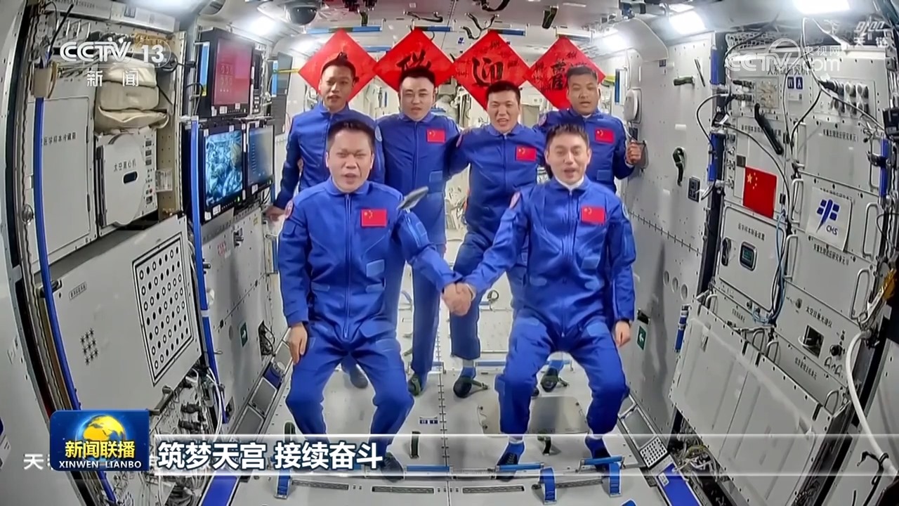 隨后,兩個航天員乘組拍下“全家?!?,共同向牽掛他們的全國人民報平安。