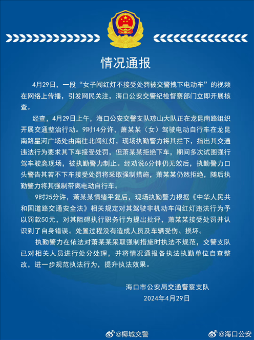 ·女子闖紅燈不接受處罰被交警拽下車???诮痪▓?bào):執(zhí)法不規(guī)范。