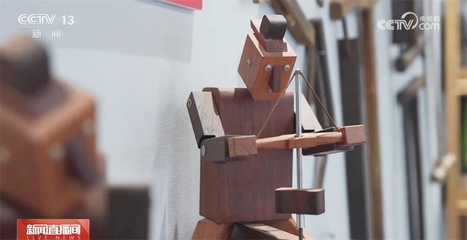 山東省非物質文化遺產(chǎn)“橋氏木作”技藝傳承人喬一兵在工作站里也有自己的工作室,他用一整塊木料,不用一釘一鉚,制作魯班枕結構的系列用品。