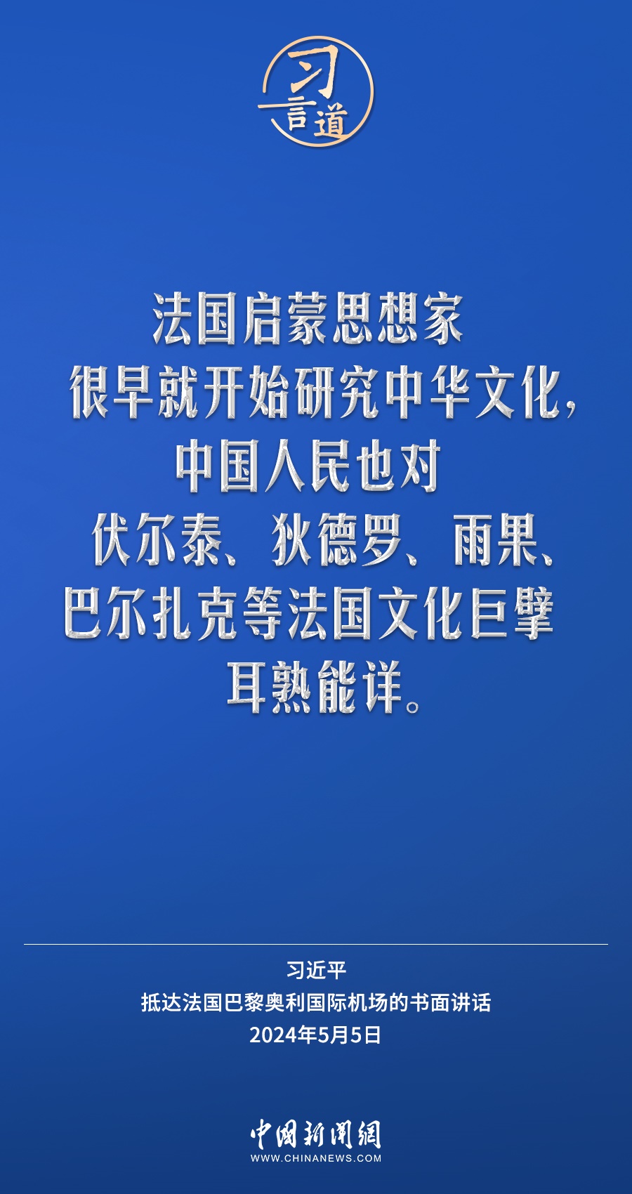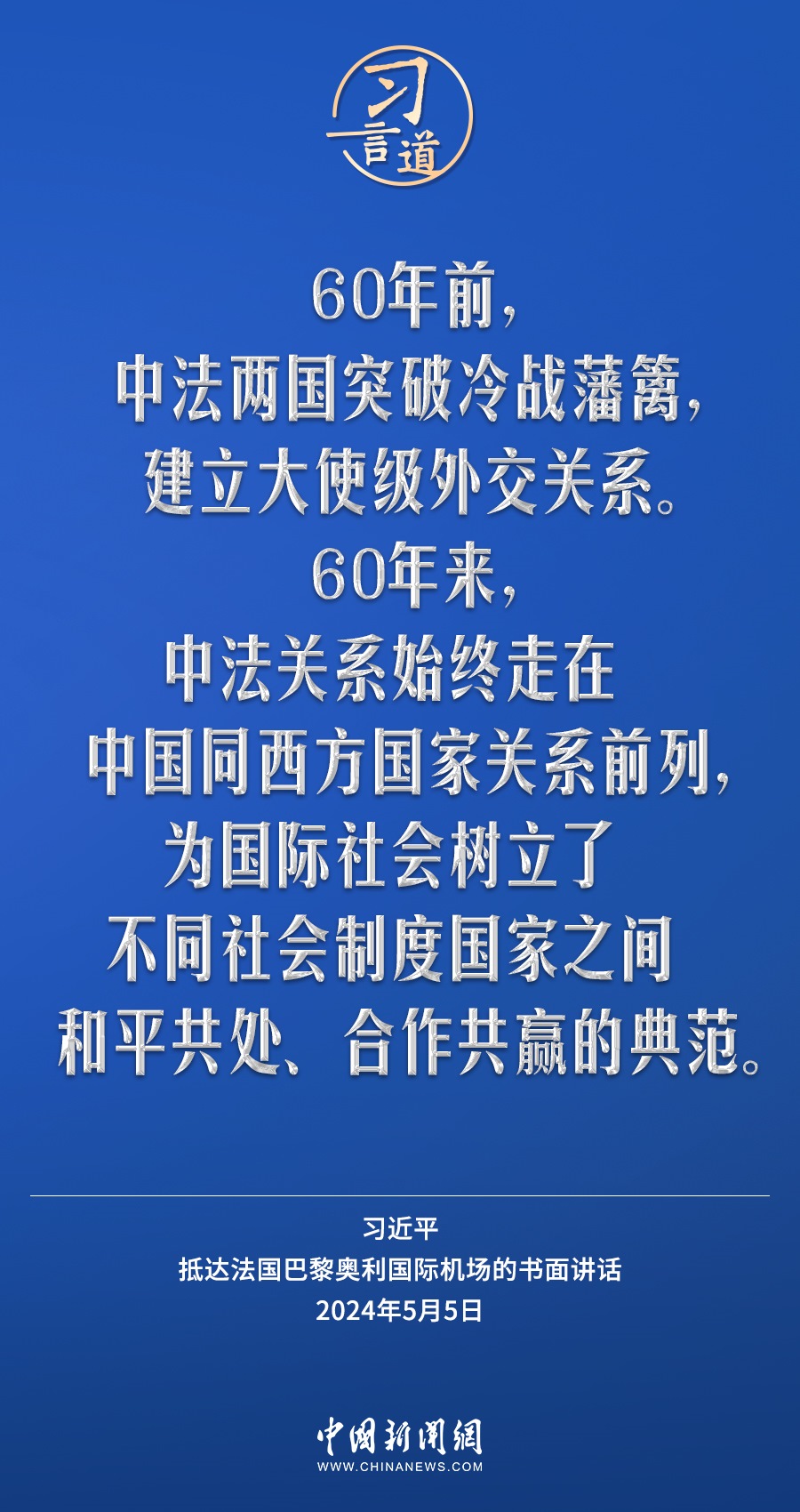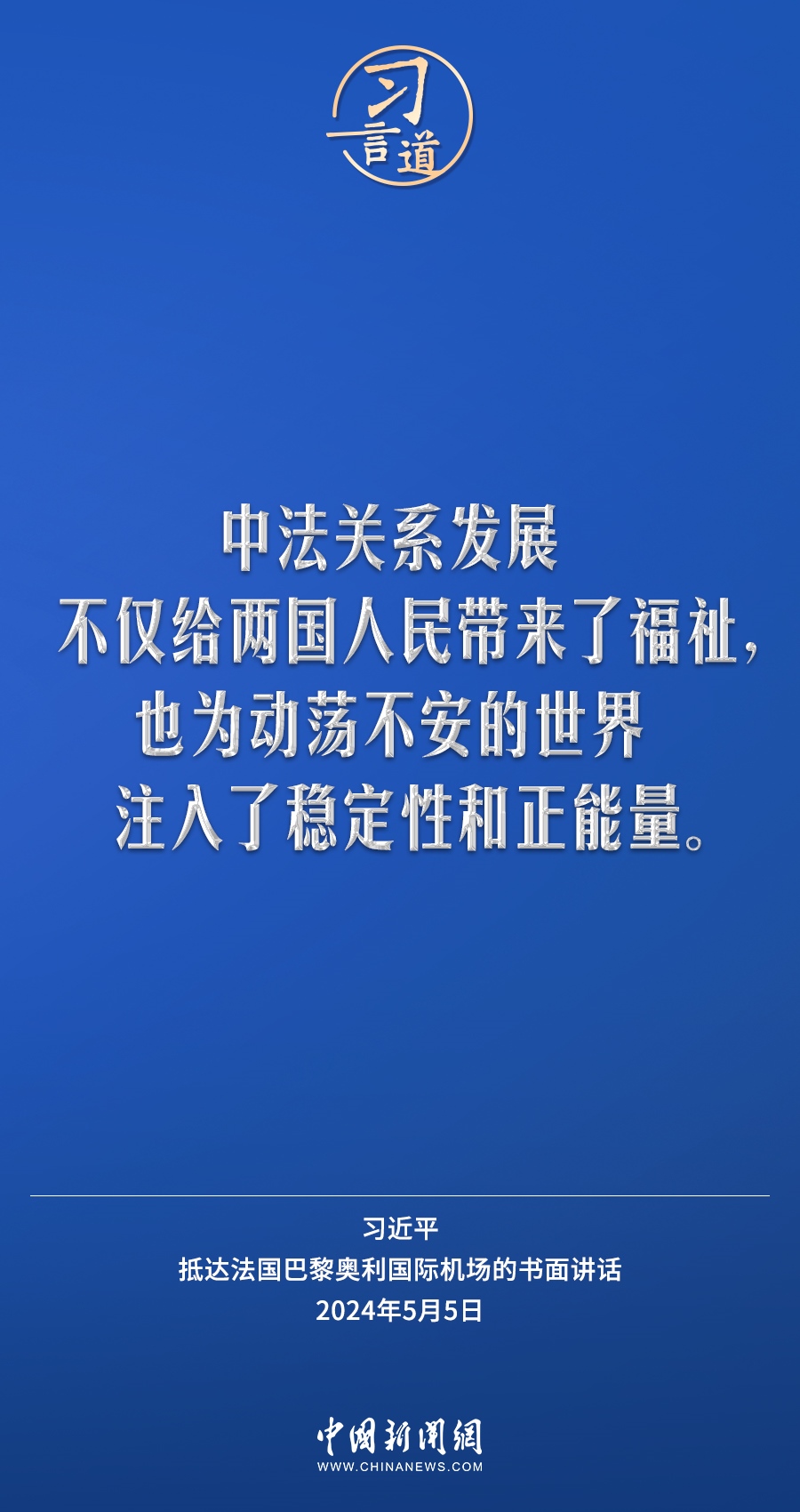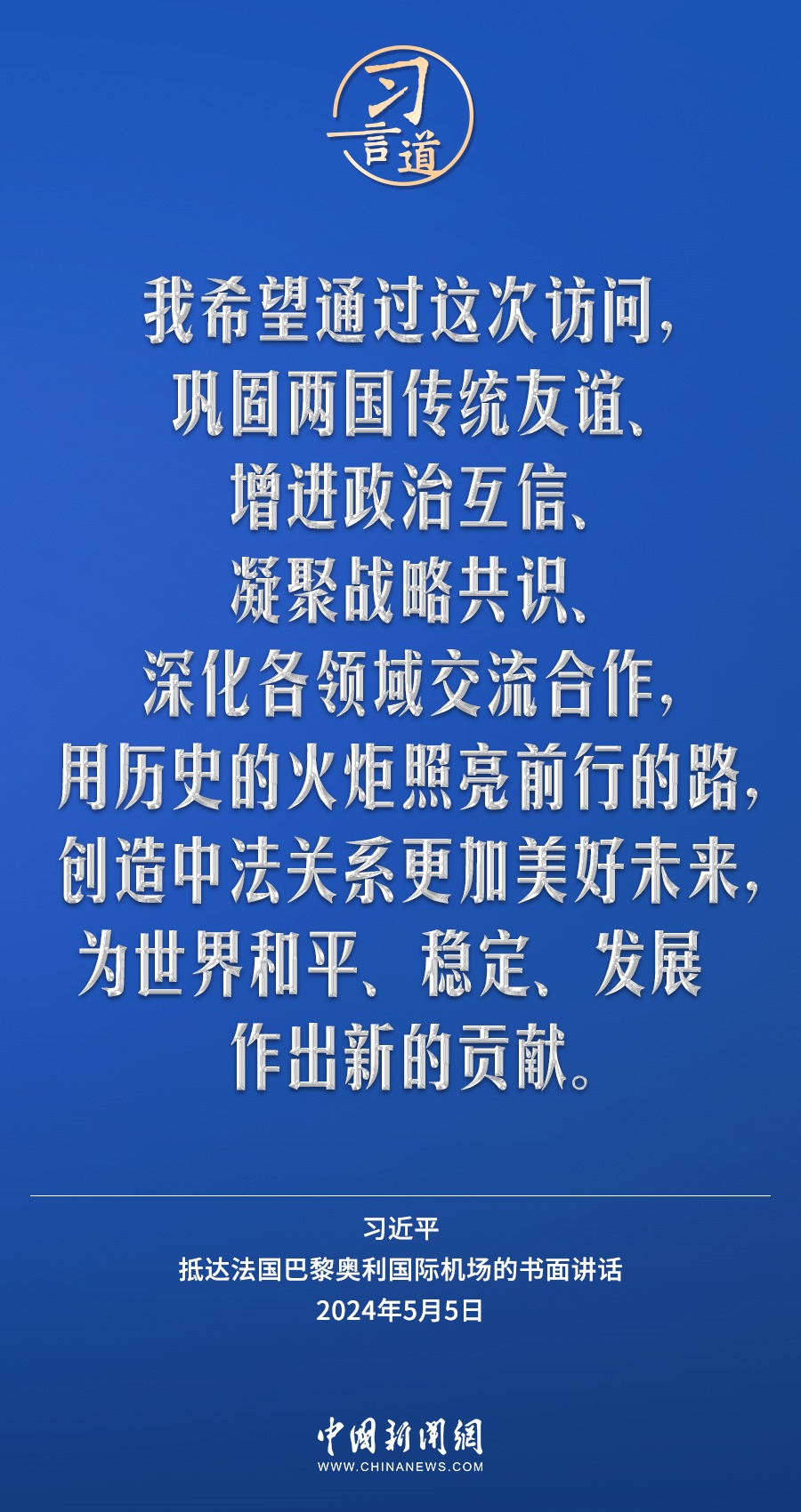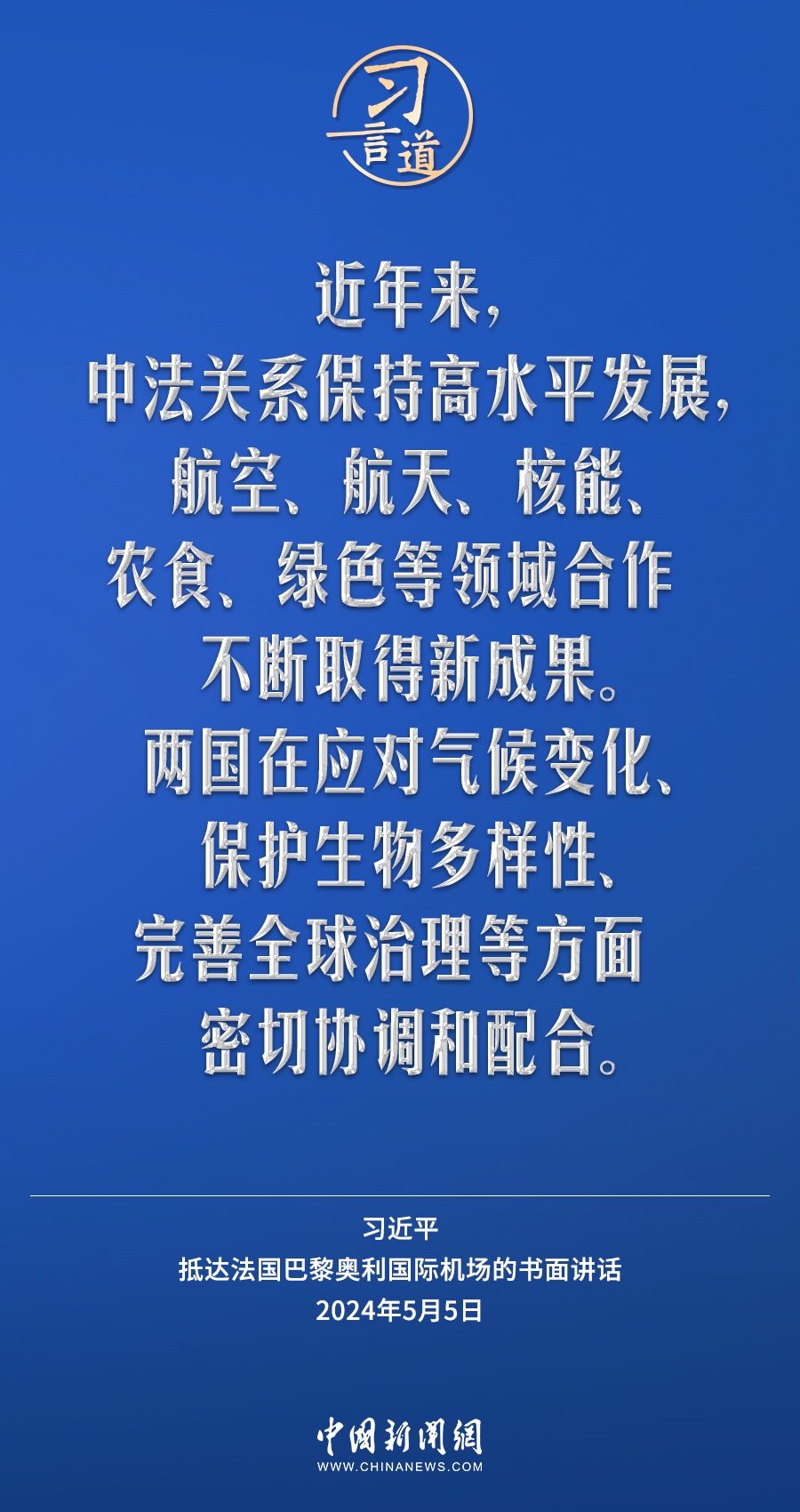 當(dāng)?shù)貢r間5月5日下午,國家主席習(xí)近平抵達巴黎,開始對法國進行國事訪問。在抵達法國巴黎奧利國際機場的書面講話中,習(xí)近平指出——