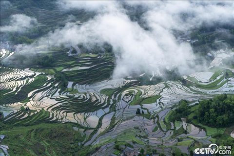2024年5月5日,重慶酉陽花田鄉(xiāng)何家?guī)r村萬畝灌水梯田等待插秧,鄉(xiāng)村云霧繚繞風景如畫。