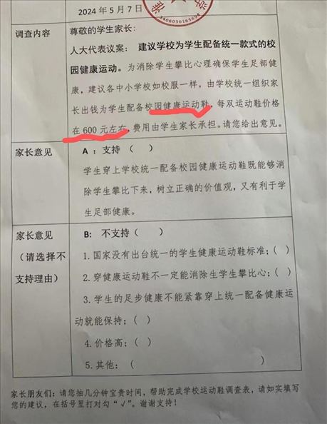 ·學校發(fā)調(diào)查表詢問家長“是否支持統(tǒng)一購置約600元一雙的運動鞋”,淮北市教育局澄清:只是采集信息,沒其他意圖。