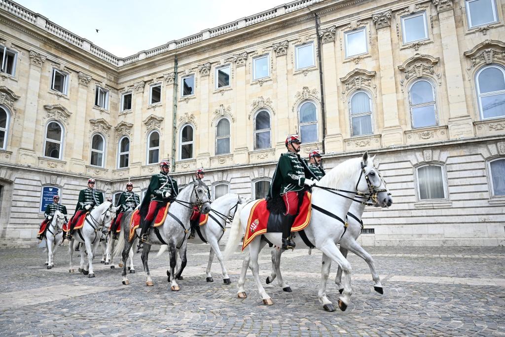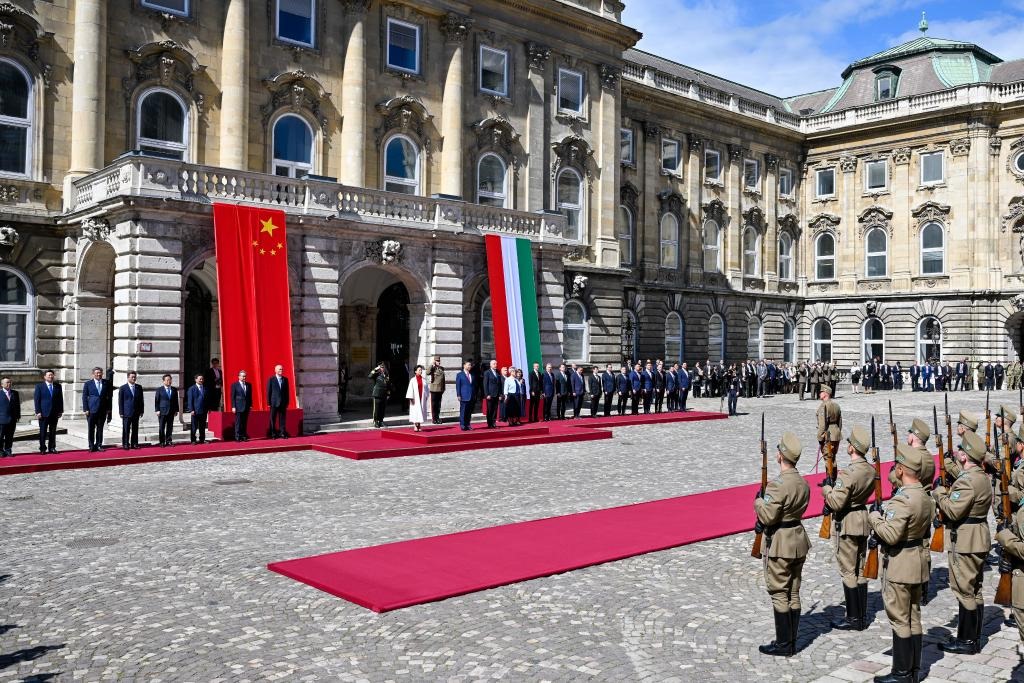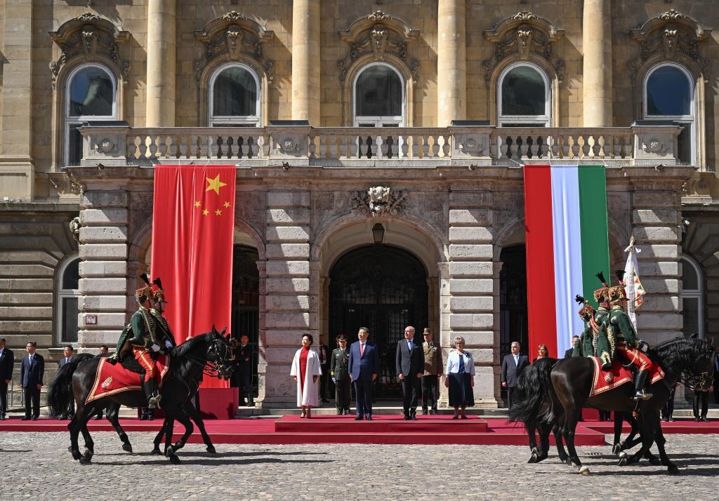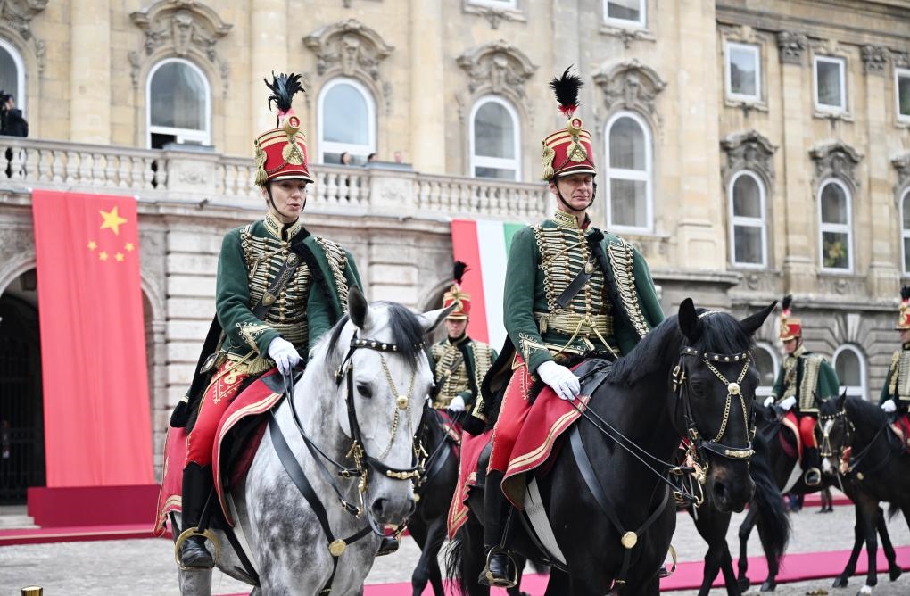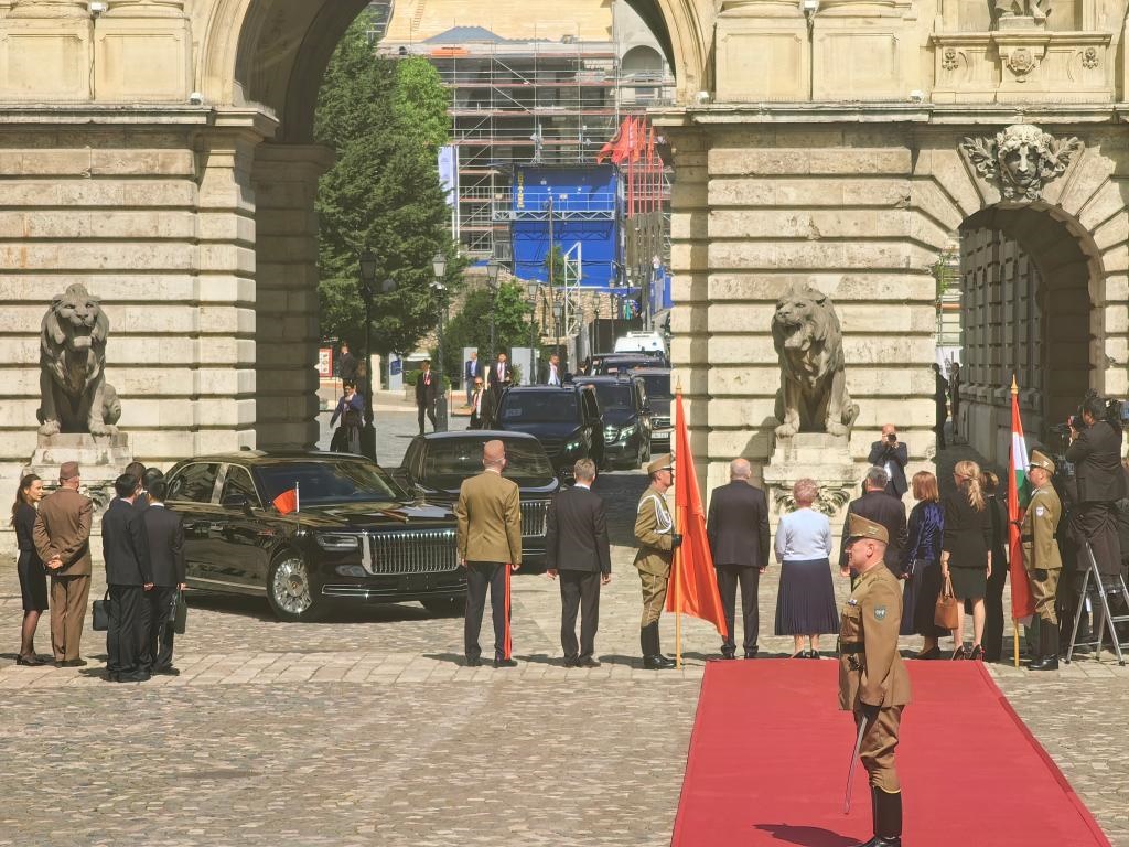 初夏時節(jié)的布達佩斯陽光明媚,古老宏偉的布達王宮莊嚴(yán)矗立,中匈兩國國旗相映成輝。習(xí)近平和夫人彭麗媛乘坐的國賓車隊在匈牙利禮賓馬隊護衛(wèi)下緩緩駛?cè)氩歼_王宮內(nèi)庭。舒尤克總統(tǒng)夫婦和歐爾班總理夫婦熱情迎接。