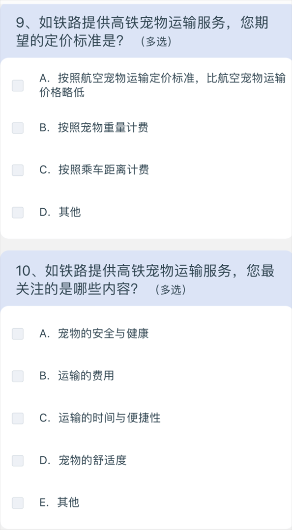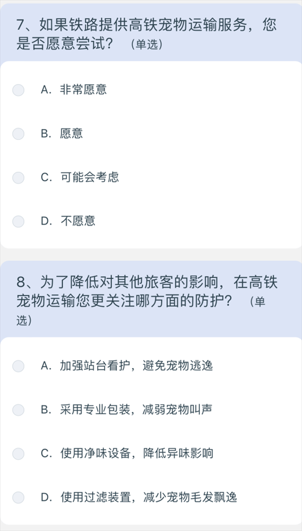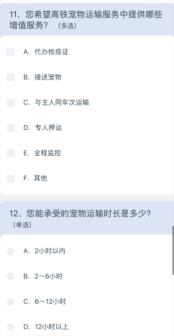5月10日上午8點40分,澎湃新聞記者通過掃描網(wǎng)友分享的列車上的二維碼,進入12306系統(tǒng),選擇問卷·建議,進入“鐵路旅客高鐵寵物運輸”調查,共15個問題,涉及養(yǎng)寵類型、是否有攜帶寵物出行的需求、如果鐵路提供寵物運輸服務是否愿意嘗試等,以及為降低對其他旅客的影響,在高鐵寵物運輸更關注哪方面的防護;如鐵路提供高鐵寵物運輸服務,期望的定價標準;如鐵路提供高鐵寵物運輸服務,最關注的內容;如果是非養(yǎng)寵人士,對高鐵寵物運輸有何建議等多方面問題。