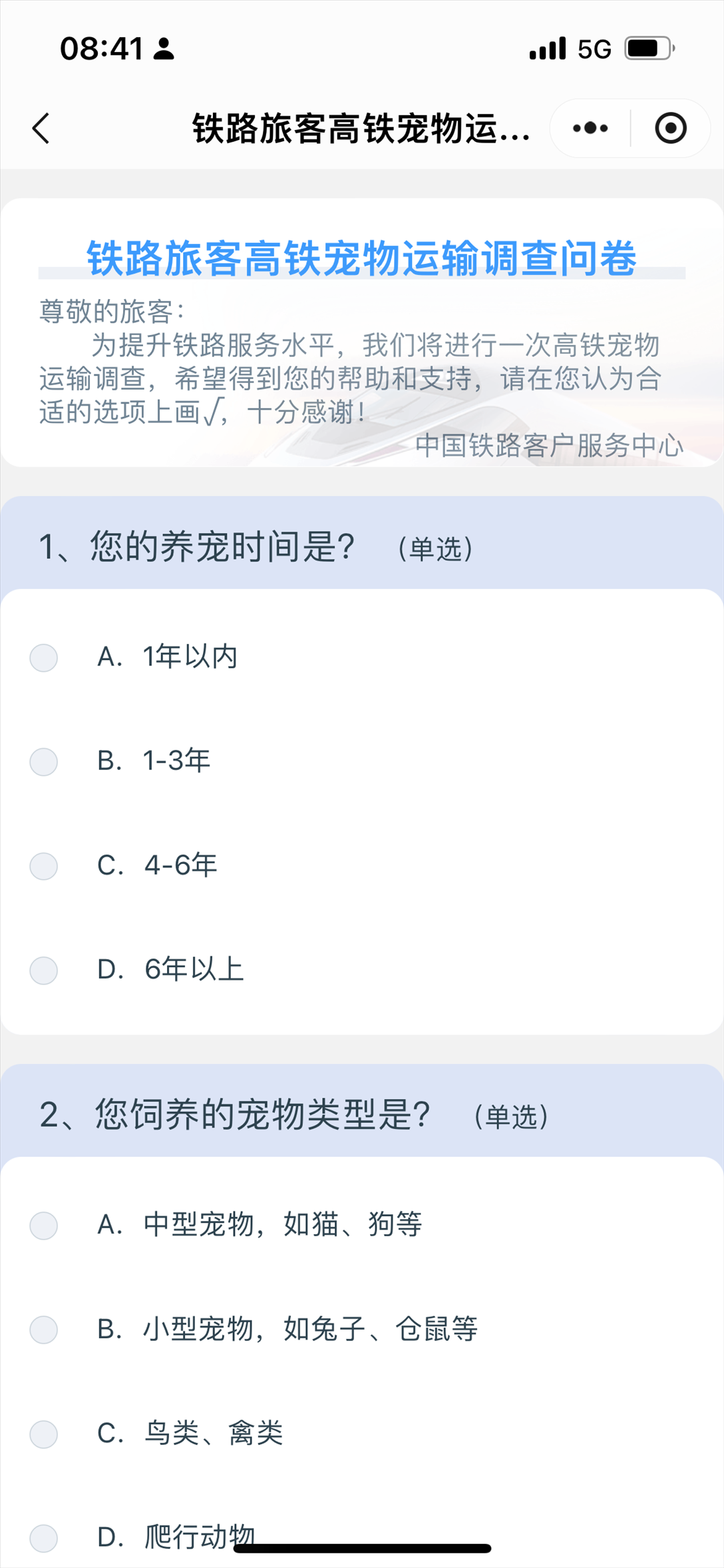 中國鐵路客戶服務中心推出高鐵寵物運輸調查問卷。 截屏圖