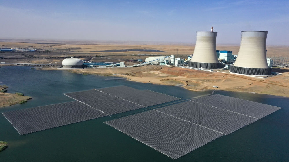 國家能源集團寧夏電力公司寧東電廠3×5.98兆瓦漂浮分布式光伏發(fā)電項目全景(無人機照片,2022年6月17日攝)。新華社記者 王鵬 攝