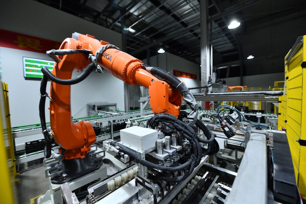 在廣西柳州市一家新能源汽車電池生產(chǎn)企業(yè),機器人在生產(chǎn)線上作業(yè)(2023年5月10日攝)。新華社記者 黃孝邦 攝