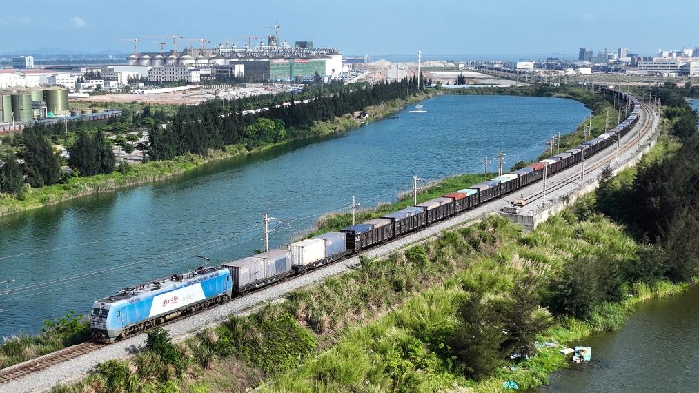 圖為一趟滿載貨物的西部陸海新通道鐵海聯(lián)運(yùn)班列從欽州港東站駛出(無(wú)人機(jī)照片)。新華社記者 張愛林 攝