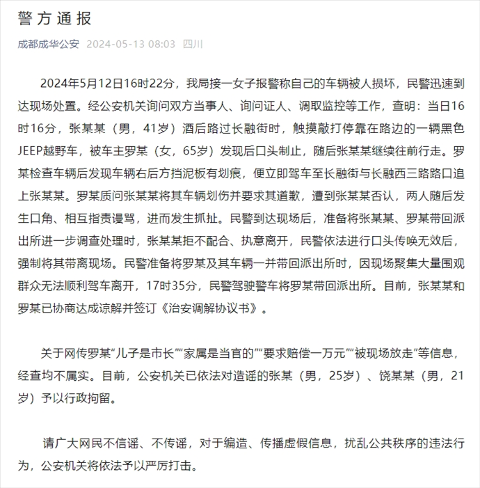 ·女子要求“觸摸”其車男子賠1萬并叫囂“兒子是市長”?成都警方:均不屬實,造謠者已被行拘。