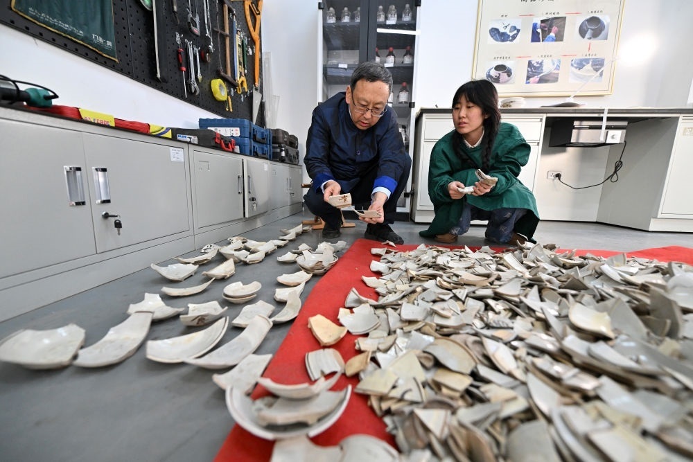 2024年2月25日,在山西云岡研究院可移動文物修復室,云岡研究院院長杭侃(左)和同事交流瓷器修復方案。