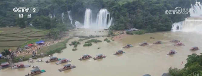 水量大增的瀑布奔騰而下沖擊著河面水聲轟鳴,慕名前來的游客們或乘坐竹筏感受瀑布的恢弘氣勢,或?qū)ふ易罴褭C(jī)位與瀑布“打卡”合影。除了近距離觀賞德天跨國瀑布,也有不少游客選擇跨境游玩,站在越南境內(nèi)的板約瀑布看德天瀑布,以不同視角體驗(yàn)中越風(fēng)情。