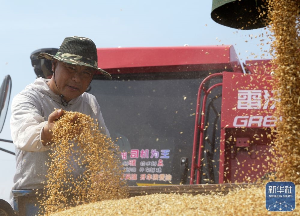 5月26日,在河南省商丘市睢縣尚屯鎮(zhèn)荒莊村,農(nóng)民查看剛剛收獲的小麥。新華社發(fā)(徐澤源攝)
