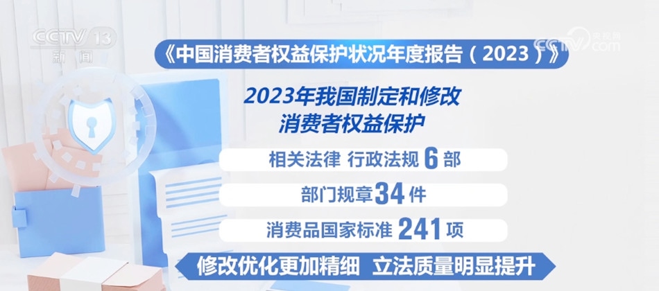 年度報告顯示,2023年我國制定和修改了消費者權(quán)益保護(hù)相關(guān)法律、行政法規(guī)6部、部門規(guī)章34件、消費品國家標(biāo)準(zhǔn)241項,修改優(yōu)化更加精細(xì),立法質(zhì)量明顯提升。