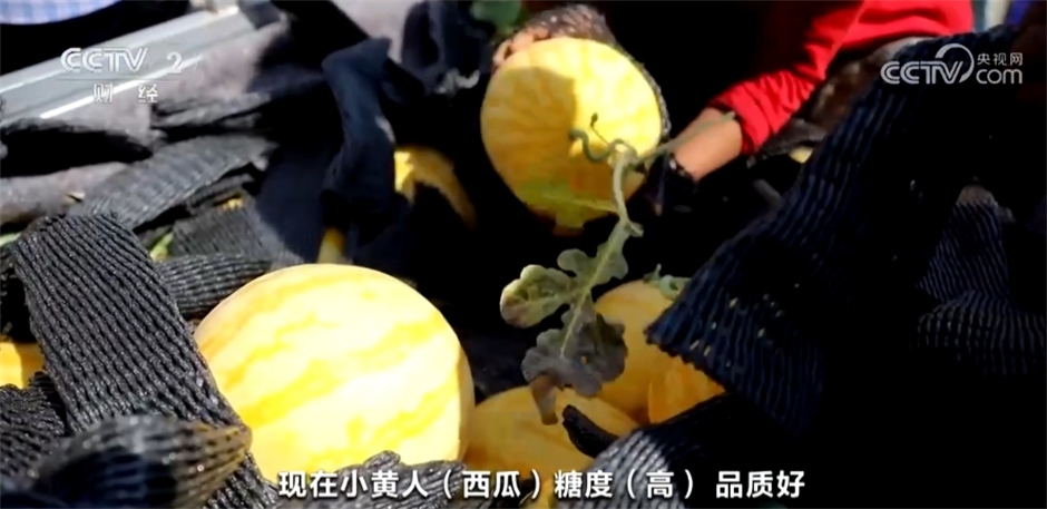 西瓜收購商稱:“我今天來這兒收小黃人西瓜,發(fā)往鄭州、北京、上海,各個大城市都發(fā)?,F(xiàn)在,小黃人西瓜糖度高、品質好。