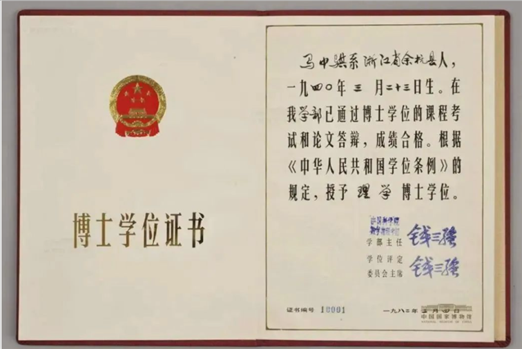 核物理學家、時任中科院數(shù)理學部主任、學部委員錢三強簽發(fā)了馬中騏的博士學位證書,證書編號是“10001”,新中國第一號。