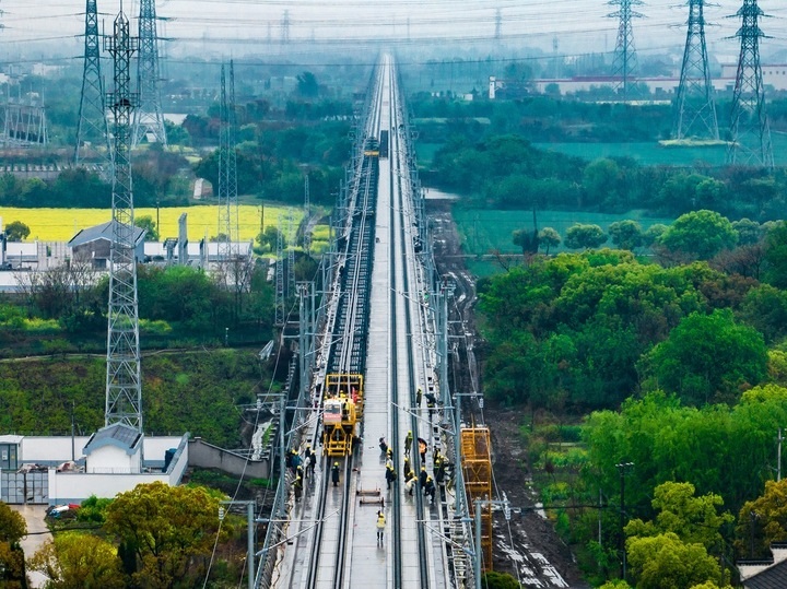 2024年4月7日,滬蘇湖鐵路鋪軌進(jìn)入湖州吳興段。拍友 閔峰 攝