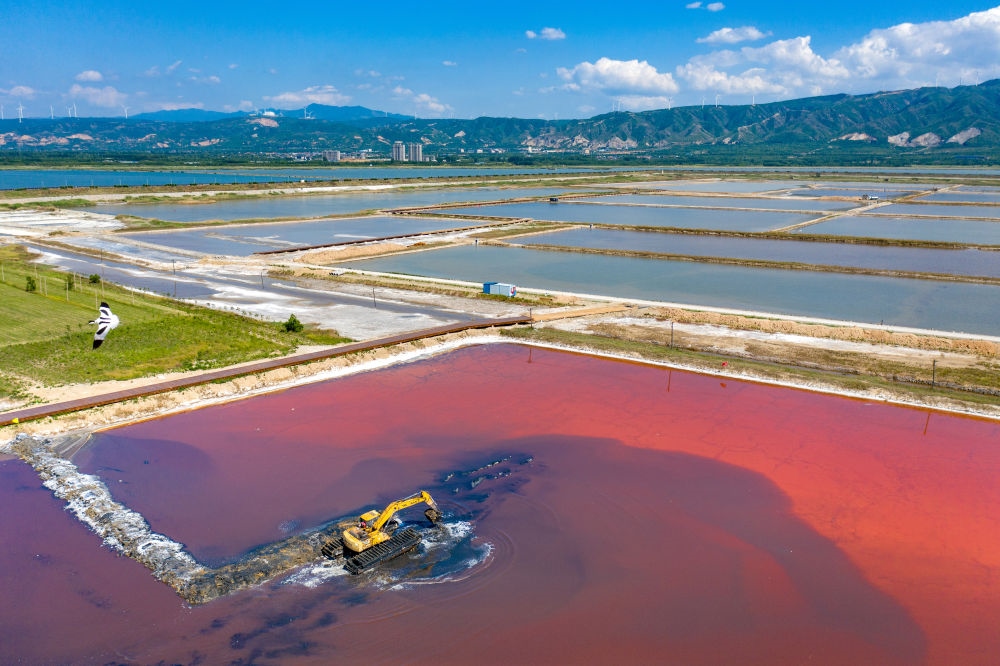2016年8月25日,工人在運城鹽湖進行扒鹽作業(yè)。