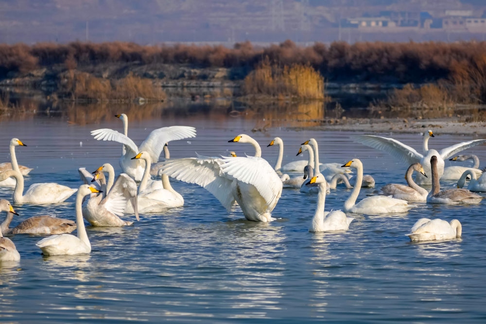 2024年1月5日,白天鵝在運城鹽湖嬉戲。