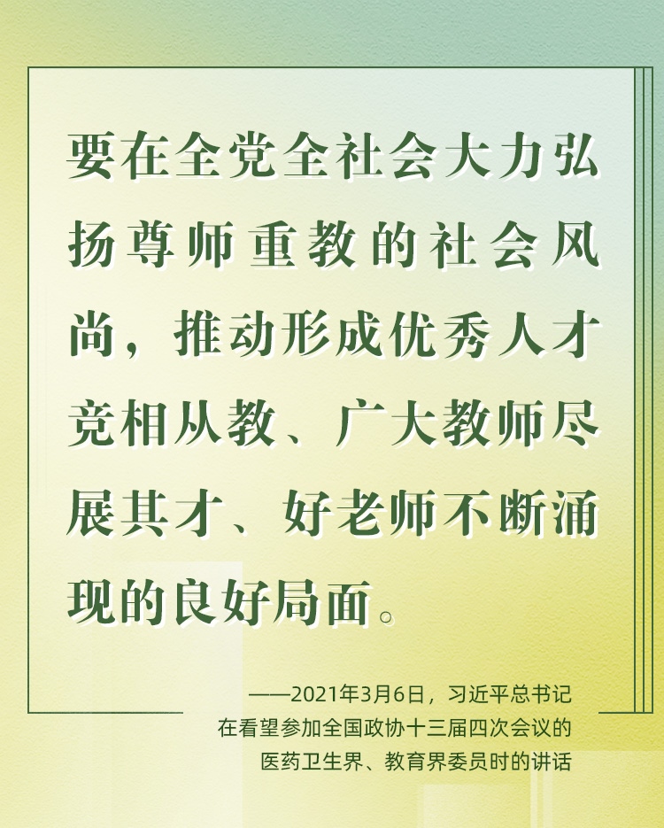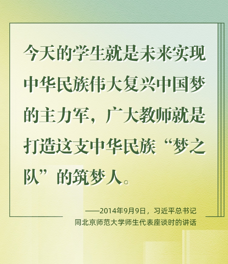 因為熱愛,所以一生堅持。老師是中華民族“夢之隊”的筑夢人,是新時代的“大先生”。從傳播知識、啟迪思想、無私奉獻,到“讓每個人都有實現(xiàn)夢想的機會”;從教書到育人,從個人到家國,從小我到大我,“培養(yǎng)德智體美勞全面發(fā)展的社會主義建設(shè)者和接班人”,老師,已然是喚起一代代學子追隨先輩、培養(yǎng)家國情懷、櫛風沐雨、砥礪前行的力量。