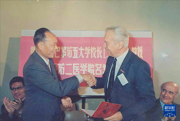 上海第二醫(yī)學(xué)院(現(xiàn)上海交通大學(xué)醫(yī)學(xué)院)校長王振義(前左)授予法國巴黎第五大學(xué)校長歐基埃名譽(yù)教授稱號(攝于1985年)。新華社發(fā)(上海交通大學(xué)醫(yī)學(xué)院供圖)