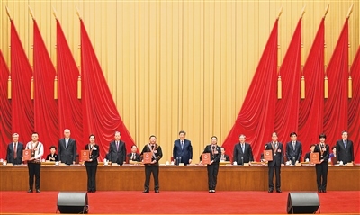 在歡快的樂曲聲中,習近平等為受表彰的模范個人和模范集體代表頒獎。