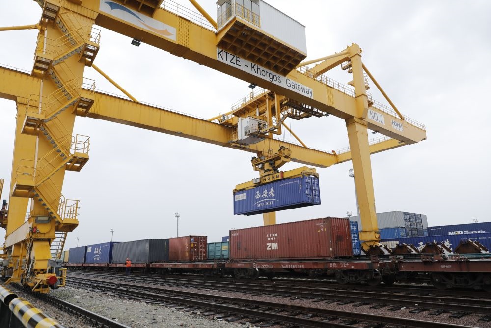 2022年5月19日,在哈薩克斯坦南部中哈邊境地區(qū)的“霍爾果斯-東大門”無水港內,龍門吊正在工作。新華社發(fā)(奧斯帕諾夫攝)