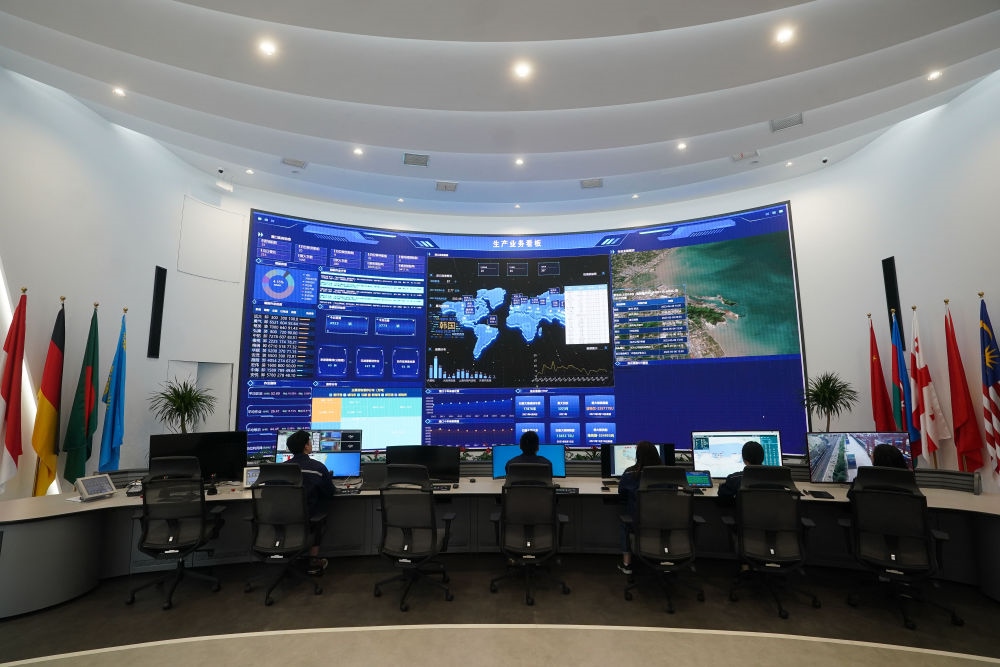 基地數(shù)字化調度中心電子屏幕上,從連云港發(fā)出和抵達連云港的中歐(中亞)班列目的地、貨源地及貨物信息一目了然,中哈邊境地區(qū)貨物運輸?shù)膶崟r畫面動態(tài)更新。