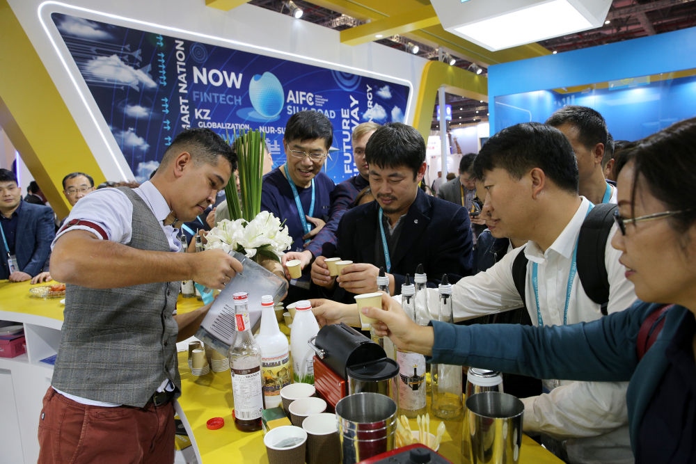 2019年11月6日,在上海進博會哈薩克斯坦國家館,調酒師為參觀者分享雞尾酒。