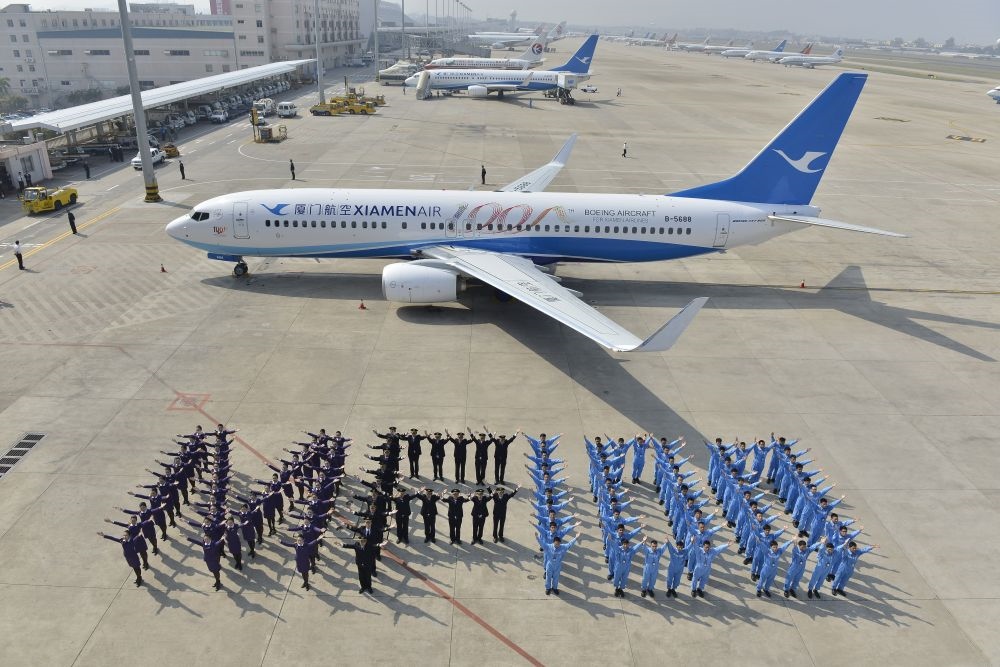 2013年11月16日,廈航機(jī)隊(duì)規(guī)模增至100架,這是廈航員工在機(jī)隊(duì)第100架飛機(jī)前擺出MF100字樣。新華社記者 項(xiàng)開(kāi)來(lái) 攝