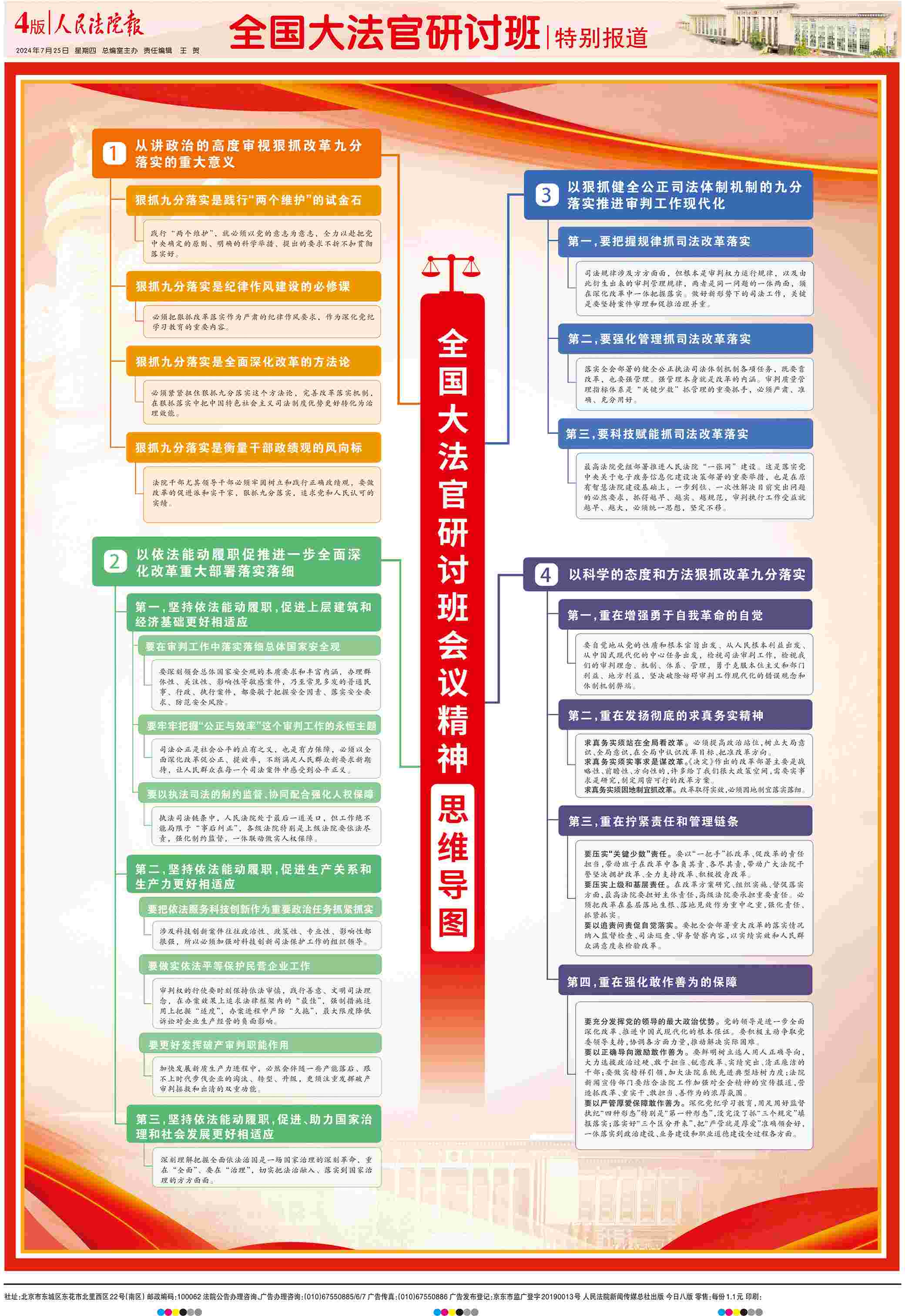 7月24日,全國(guó)大法官研討班舉行。此次研討班的主要任務(wù)是:堅(jiān)持以習(xí)近平新時(shí)代中國(guó)特色社會(huì)主義思想為指導(dǎo),全面貫徹落實(shí)黨的二十大和二十屆二中、三中全會(huì)精神,深入貫徹習(xí)近平法治思想,認(rèn)真學(xué)習(xí)領(lǐng)會(huì)黨中央關(guān)于進(jìn)一步全面深化改革的戰(zhàn)略部署,深化思想認(rèn)識(shí),狠抓九分落實(shí),加快推進(jìn)審判工作現(xiàn)代化,努力為以中國(guó)式現(xiàn)代化全面推進(jìn)強(qiáng)國(guó)建設(shè)、民族復(fù)興偉業(yè)提供有力司法服務(wù)保障。