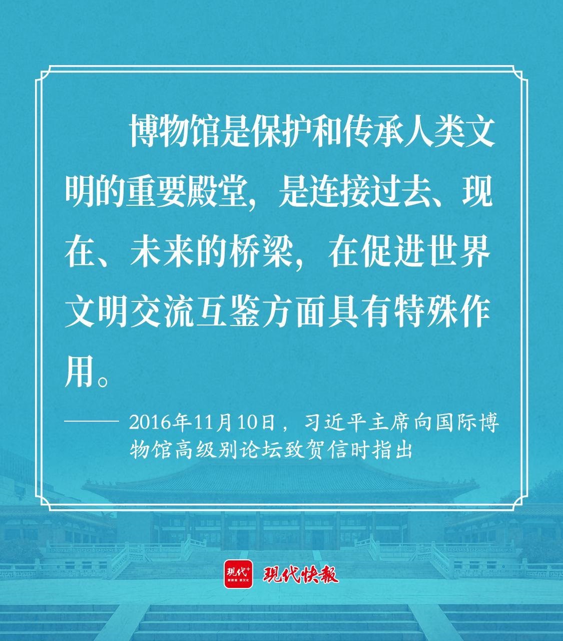 2016年11月10日,習(xí)近平主席向國際博物館高級別論壇致賀信時指出,博物館是保護(hù)和傳承人類文明的重要殿堂,是連接過去、現(xiàn)在、未來的橋梁,在促進(jìn)世界文明交流互鑒方面具有特殊作用。