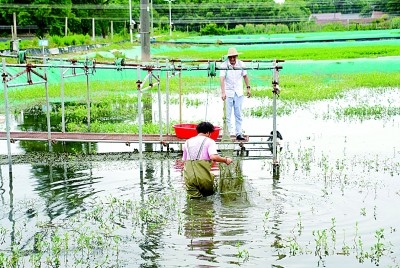 上海海洋大學(xué)師生在蟹塘檢查“白玉蟹”蛻殼情況。新華社發(fā)