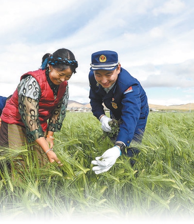 西藏日喀則市崗巴縣援藏干部幫助村民清除青稞田間的雜草。趙啟瑞攝(人民視覺)