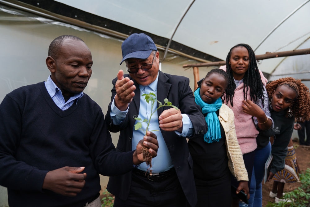 2023年9月18日,在肯尼亞納庫魯郡舉辦的中非農(nóng)業(yè)發(fā)展和減貧示范村番茄生產(chǎn)培訓班上,來自中國的農(nóng)學教授劉高瓊(左二)為肯方學員指導農(nóng)業(yè)技術。多年來,中國農(nóng)業(yè)專家在當?shù)亻_展了知識培訓、技術指導和農(nóng)業(yè)設施修繕等工作,有效助力中國先進的農(nóng)業(yè)技術在納庫魯?shù)貐^(qū)的示范推廣,幫助農(nóng)民實現(xiàn)增收減貧的目標。