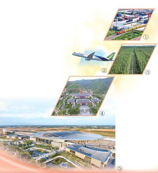 圖①:中歐班列從國(guó)鐵集團(tuán)鄭州局圃田車站駛出。國(guó) 徽攝(影像中國(guó))圖②:國(guó)產(chǎn)大型客機(jī)C919。鄧智煒攝(新華社發(fā))圖③:新疆溫宿縣柯柯牙的“三北”防護(hù)林。新華社記者 李 響攝圖④:中國(guó)國(guó)家版本館中央總館。本報(bào)記者 陳 斌攝圖⑤:雄安站。宋 宇攝(影像中國(guó))