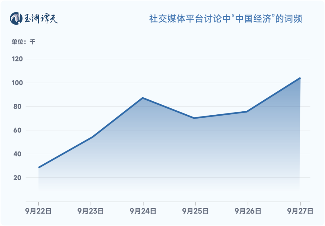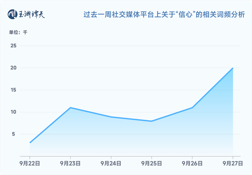 從這張曲線圖上可以看到,輿論場對“中國經(jīng)濟(jì)”的討論,在過去一周經(jīng)歷了2個(gè)峰值。其中,“信心”這個(gè)詞出現(xiàn)的頻率經(jīng)歷了兩次躍升。