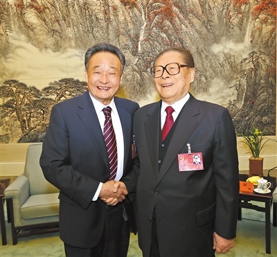 2012年11月14日,中國共產(chǎn)黨第十八次全國代表大會在北京閉幕。這是閉幕會前,江澤民同志與吳邦國同志在一起。新華社記者 蘭紅光攝