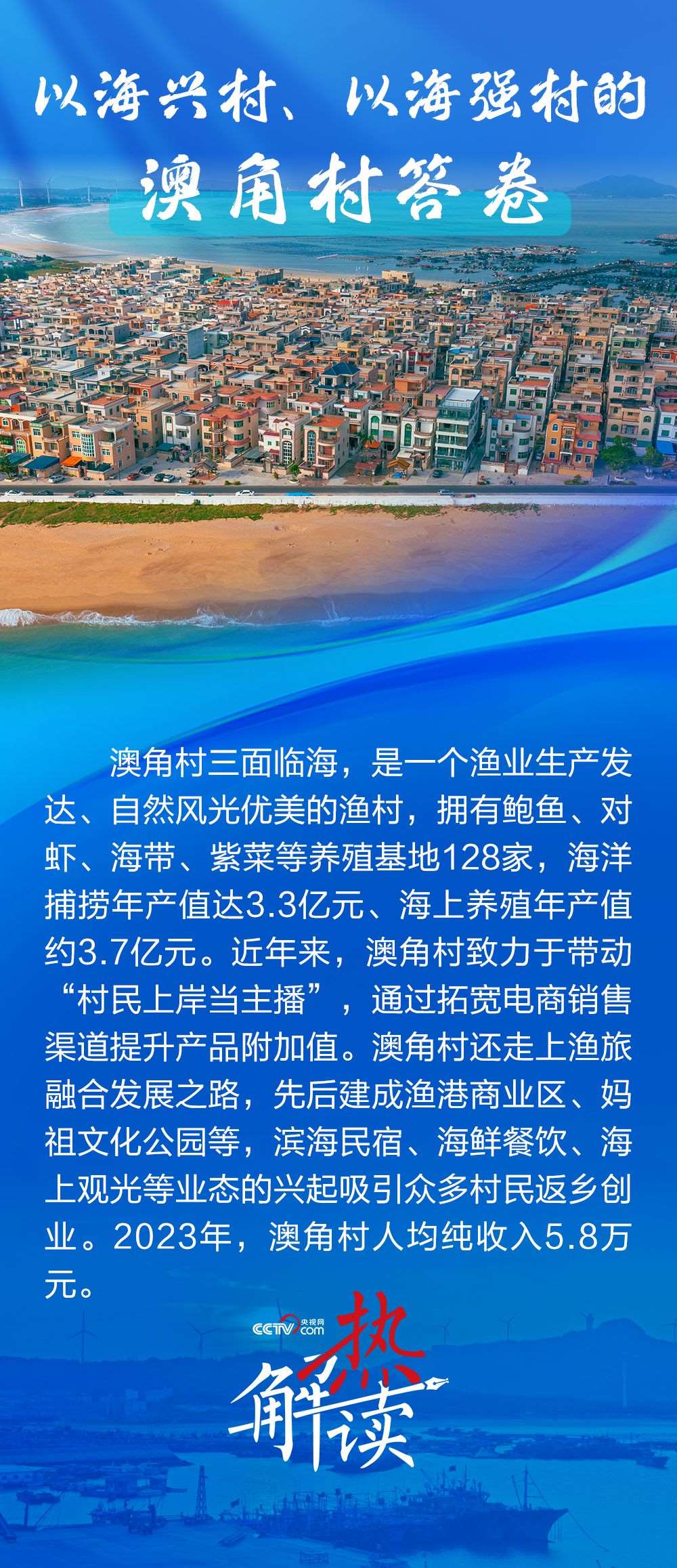 澳角村三面臨海,近年來走出了一條以海興村、以海強村的新路子。看到鄉(xiāng)村發(fā)生了巨變,總書記直言“鄉(xiāng)村振興還是要發(fā)揚優(yōu)勢”,并勉勵澳角村做好“?!钡奈恼?,在鄉(xiāng)村振興、共同富裕的道路上一往無前。