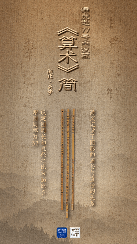簡牘里的《算術(shù)》,是古人科學(xué)智慧的精彩呈現(xiàn)。三枚關(guān)于計算圓形田地面積方法的西漢簡牘保存完好,為首次公開展出?!坝斜瀸碇笔c五侍之”,睡虎地漢簡中列舉的這道算術(shù)題顯示,周長和直徑之比為16:5,即圓周率為3.2,證明秦漢之際已有人認識到比3更精確的圓周率,為出土簡牘所僅見,尤其珍貴。