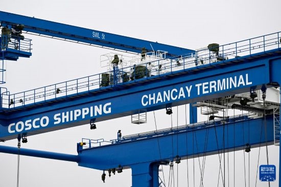 這是6月21日在秘魯錢(qián)凱港拍攝的印有“中遠(yuǎn)海運(yùn),錢(qián)凱碼頭”字樣的軌道吊。 新華社記者 李木子 攝