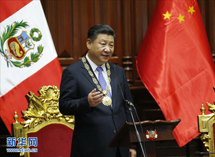 當(dāng)?shù)貢r(shí)間2016年11月21日,國(guó)家主席習(xí)近平在秘魯國(guó)會(huì)發(fā)表題為《同舟共濟(jì)、揚(yáng)帆遠(yuǎn)航,共創(chuàng)中拉關(guān)系美好未來》的重要演講。新華社記者 鞠鵬 攝