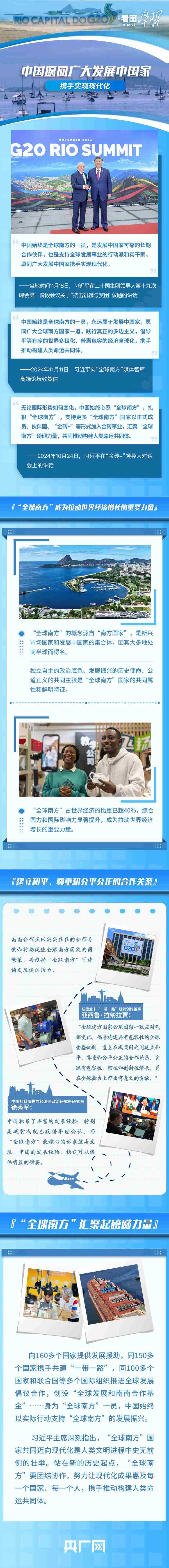 當(dāng)?shù)貢r間11月18日,習(xí)近平主席在G20峰會第一階段會議就“抗擊饑餓與貧困”議題發(fā)表重要講話,呼吁作為世界主要大國領(lǐng)導(dǎo)人應(yīng)該秉持命運(yùn)共同體意識,扛起歷史責(zé)任、展現(xiàn)歷史主動、推動歷史進(jìn)步。習(xí)主席表示,中國始終是“全球南方”的一員,是發(fā)展中國家可靠的長期合作伙伴,并宣布中國支持全球發(fā)展的八項(xiàng)行動,愿同各方一道行動,建設(shè)一個共同發(fā)展的公正世界。
