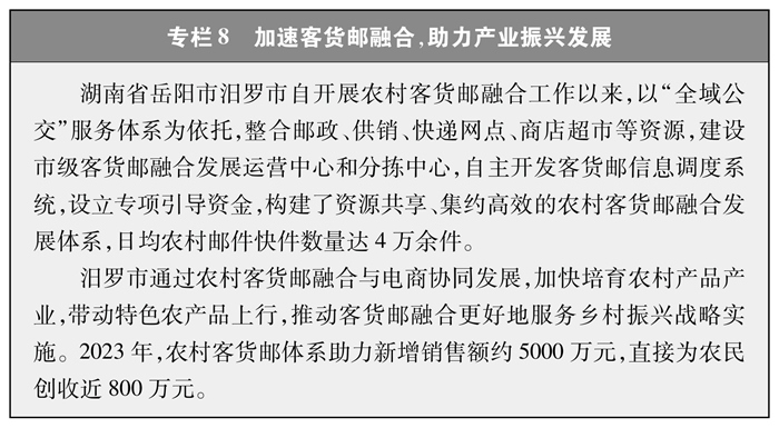 加快推進農(nóng)村客貨郵融合發(fā)展。為統(tǒng)籌解決農(nóng)村客運可持續(xù)運營、快遞下鄉(xiāng)進村和農(nóng)產(chǎn)品出村進城難題,發(fā)布《關(guān)于加快推進農(nóng)村客貨郵融合發(fā)展的指導(dǎo)意見》,堅持“政府引導(dǎo)、市場主導(dǎo)”,深入推進農(nóng)村客貨郵運行機制、基礎(chǔ)設(shè)施、運輸線路、運營信息等共建共享,加強資源統(tǒng)籌利用,推動融合發(fā)展(專欄8)。截至2023年底,所有省份和超70%地級以上城市建立了交通運輸、郵政、商務(wù)、供銷等部門共同參與的工作機制,共開通農(nóng)村客貨郵合作線路1.1萬余條,共建成縣、鄉(xiāng)、村三級客貨郵服務(wù)站點9萬余個,形成“客運郵路”“貨郵同網(wǎng)”等典型模式,有效鞏固了通客車成果,農(nóng)村物流、郵政快遞降本增效取得明顯進展,帶動了農(nóng)村電商、特色產(chǎn)業(yè)等蓬勃發(fā)展。